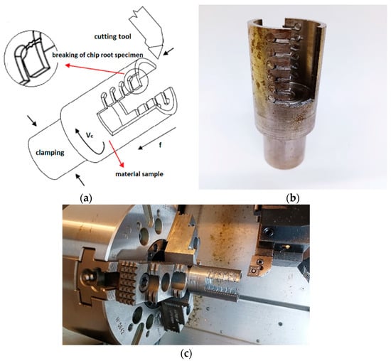 Figure 1 shows material samples that were made for obtaining the cutting zone specimens. A schematic illustration of the process of obtaining the cutting zone specimen is shown in Figure 1a [54]. Steel rods with a diameter of 4 mm were pressed into the holes, which also had a diameter of 4 mm. Thin sheets were pressed into the grooves, as seen in Figure 1b. The material sample was clamped into the hydraulic three-jaw chuck (Figure 1c). It was confirmed by experiments that the process of obtaining the cutting zone specimens for observation of the cutting zone is very reliable.