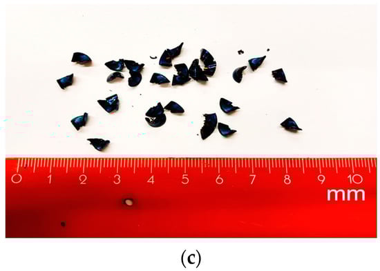 Chips after machining C45 medium carbon steel when vc = 180 m/min and feed: (a) f = 0.2 mm; (b) f = 0.4 mm; (c) f = 0.6 mm.
