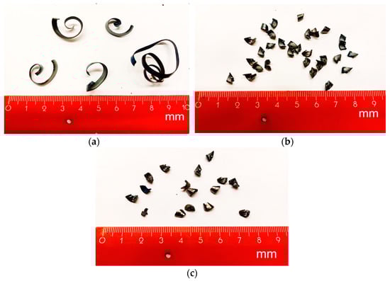 Chips after machining 62SiMnCr4 tool steel, vc = 145 m/min and feed: (a) f = 0.2 mm; (b) f = 0.4 mm; (c) f = 0.6 mm.