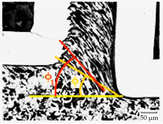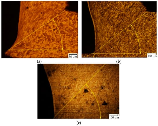 The cutting tool had a geometrical parameter of an end cutting angle (αn) of 6° and lip angle (βn) of 86°. The shear plane angle ϕ was measured directly in the microstructure specimen (Figure 6). By using these parameters, the chip compression was estimated by Equation (2) [56] for each specimen. Deformations in the cutting zone and chip compressions of each parameter are in Table 4, where deformation and chip compression were calculated according to Equations (1) and (2), respectively. The measurements were repeated three times due to statistical validity; however, only the average values are recorded in Table 4. Figure 8 and Figure 9 show the selected resultant microstructure with a shear plane angle for both materials.