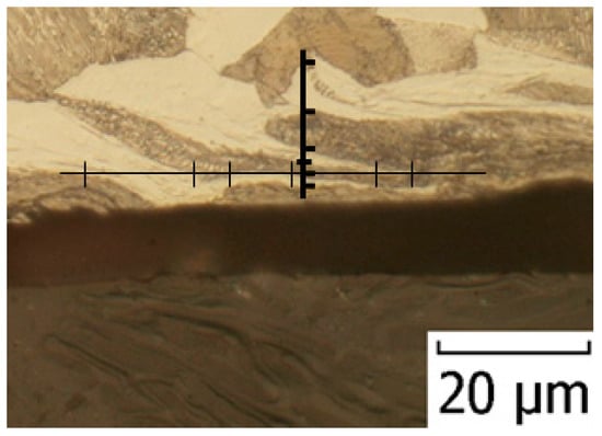 Using a quantitative metallography (more specifically, Saltykov stereology methods with oriented test lines), the anisotropic microstructure was decomposed into isotropic- and planar-oriented components. The test lines were placed on a metallographic cut. The lines were parallel and perpendicular to the grain boundaries’ orientation affected by straining: In the primary area, the lines were parallel to the orientation of the texture, the slip plane (pitch angle ϕ1 in Figure 5); in the secondary area, the lines were parallel to chip/tool interface, the tool face; in the tertiary area, the lines were parallel to the machined surface. From the specific number (length unit number) of parallel test lines’ intersections with grain boundaries (PL)P and perpendicular lines’ intersections (PL)O, the planar-oriented part of the specific surface area (SV)OR of the grains and the total specific surface area (SV)TOT of the grains were calculated. The degree of orientation of the grain boundaries O was calculated as the ratio of (SV)OR and (SV)TOT from these values. This procedure of measurement is shown in Figure 7.