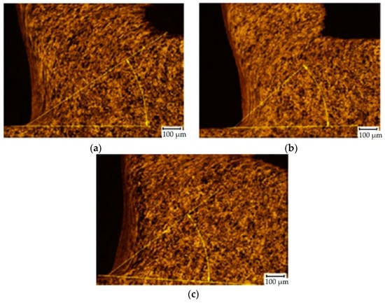 Examples of SEM micrographs of the cutting zone (62SiMnCr4 tool steel, vc = 145 m/min): (a) specimen no. 16 (f = 0.2 mm), ϕ = 36°; (b) specimen no. 17 (f = 0.4 mm), ϕ = 43°; (c) specimen no. 18 (f = 0.6 mm), ϕ = 44°.