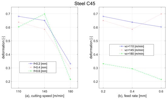 Graph of deformation dependence of Steel C45 on: (a) cutting speed; (b) feed rate.