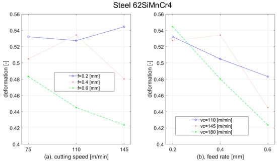 Graph of deformation dependence of Steel 62SiMnCr4 on: (a) cutting speed; (b) feed rate.