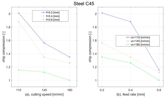 Graph of chip compression dependence of Steel C45 on: (a) cutting speed; (b) feed rate.