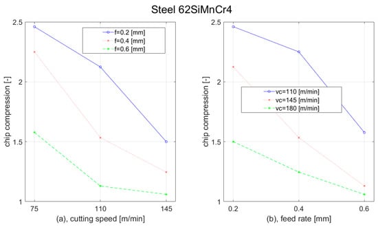 Graph of chip compression dependence of Steel 62SiMnCr4 on: (a) cutting speed; (b) feed rate.