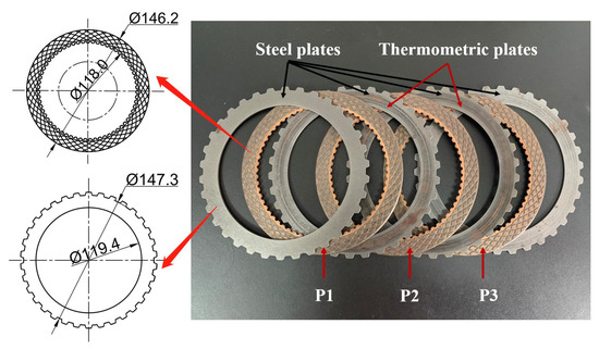 As shown in Figure 1, the clutch pack is a six-friction-pairs system composed of four steel plates and three friction discs named P1, P2, and P3, respectively. The friction disc consists of a friction core and friction lining, and the steel plates and fiction cores are made of 65 Mn steel. The hardness of the steel plate ranges from 42 HRC to 48 HRC, the flatness is less than 0.20, and the roughness is required to be Ra0.8 to Ra1.25. Furthermore, it should be highlighted that there are two kinds of CBFMs. More exactly, the CBFM-A contains Cu(70 wt%), Sn(6 wt%), Zn(5 wt%), SiO2(5 wt%), Graphite(6 wt%), and some other additives (8 wt%). Based on A, a certain SCN is added to form the CBFM-B.