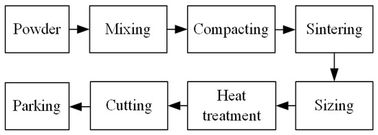 The spark plasma sintering processing technology is used to make the initial surfaces rough and porous to maintain a certain COF. The manufacturing process of the test sample is shown in Figure 2. As shown in Figure 1, The CBFM-A and CBFM-B have the same construction dimensions whose inner and outer diameters are 118.0 and 146.2 mm, respectively. The bisecting double-helical grooves, accounting for around 50% of the disc area, are designed in contact with the surface to guild oil and dissipate heat. The groove depth is about 0.3 mm, and 1.5 mm in width. The inner and outer diameters of the steel plate are 119.4 mm and 147.3 mm, respectively.