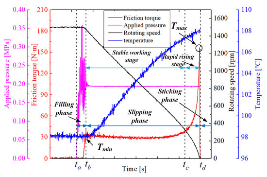 Subsequently, the friction torque increases steeply and reaches Tmin at tb, the clutch temperature increases and the rotating speed decreases at the same time. The period from ta to tb is called the filling phase. The sliding phase is from tb to td, including the stable working stage and rapid rising stage. The obvious feature of the stable working stage is that the friction torque remains in a relatively stable range, showing a flat curve in Figure 3. As the rotating speed decreases, the friction torque rises sharply from tc and reaches the maximum value (Tmax) at td, which is the rapid rising stage. The period after td is the sticking phase. Each engagement cycle is continuously repeated five times, and the measurement system stores one of the experimental data as the result randomly.