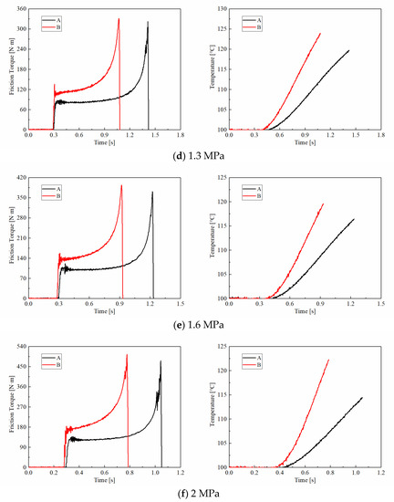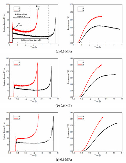 The friction torque curves of CBFM-A and CBFM-B under the different applied pressures ranging from 0.3 MPa to 2 MPa are shown in Figure 4. At the early slipping phase, the friction torques of CBFM-A and CBFM-B both fluctuate severely. This is mainly due to the changes in contact status. The oil films can be easily formed on the contact surface at the filling phase; as the applied pressure is loaded, the films are squeezed seriously. When the applied pressure becomes stable, the asperities contact dominates the engagement process, which not only hinders the formation of oil films but also accelerates theirs cracking. Thus, changes of contact status between friction pairs lead to violent fluctuations in friction torque curves.
