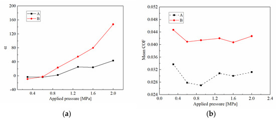 After that, the friction torque keeps in a relatively stable stage. In this stage, the friction torque of CBFM-B is higher than that of CBFM-A under all preset pressures. More exactly, as shown in Figure 4a, the mean friction torque of CBFM-A is 19 N m, and this of CBFM-B is 31 N m. Otherwise, Tmax and Tmin of A are 66 and 34 N m, and these of CBFM-B are 88 and 53 N m. In general, the friction torques of CBFM-A and CBFM-B both increase apparently with the applied pressure. Furthermore, the variation of friction torque with engagement time is diverse in this stage. As shown in Figure 5a, the variable coefficients of A are −3.46, −3.24 under 0.3 and 0.6 MPa, respectively, and the values of CBFM-B are −6.34 and −2.67. The variable coefficients are below zero which indicates that the friction torques tend to decrease in the stable working stage. It can be noted that the variable coefficients of CBFM-B rise faster than that of CBFM-A, as shown in Figure 5a. Overall, the friction torque of CBFM-B is significantly higher than that of CBFM-A in the experiment. The variable coefficients of CBFM-A and CBFM-B both increase with applied pressure steeply, but the increase of CBFM-B is sharper. The features of friction torque and the variable coefficient can be given the reasons as follows.