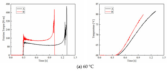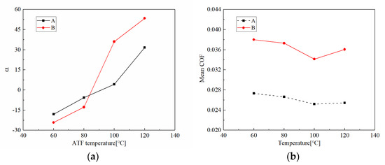 ATF temperature is a vital factor affecting the clutch friction performance. As shown in Figure 6, the friction torques of CBFM-B are also higher than that of CBFM-A under temperature conditions. More exactly, as the ATF temperature increases, the mean friction torques of CBFM-A are 108, 96, 88, and 85 N·m. The mean friction torques of CBFM-B are 145, 138, 136, 135 N·m under the same conditions. The difference is also reflected in the maximum values of friction torque. The Tmax of CBFM-A are 460, 460, 420, and 377 N·m, respectively, and these of B are 430, 451, 395, and 374 N·m. It also can be noticed that the Tmaxs of CBFM-A and CBFM-B decrease gradually with the ATF temperature. As shown in Figure 7a, the variable coefficients of CBFM-A are from −18.62 to 31.62, and this of CBFM-B increases from −24.35 to 52.25. It means that the variable coefficients of CBFM-A and CBFM-B increase expeditiously with the rise of ATF temperature. Although the value of CBFM-A is high than CBFM-B at a temperature below 80 °C however, the variable coefficient of CBFM-B is significantly higher than that of CBFM-A as the ATF temperature increases. Thus, the results can be concluded that the friction torque of CBFM-A and CBFM-B are both affected by ATF temperature, and the change rate of CBFM-B is faster indeed.