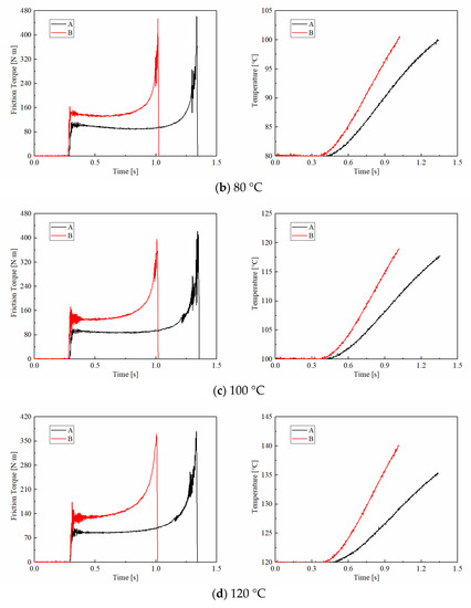Variations of the friction torque and surface temperatures of CBFM-A and CBFM-B. (a) 60 °C, (b) 80 °C, (c) 100 °C, (d) 120 °C.