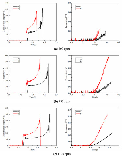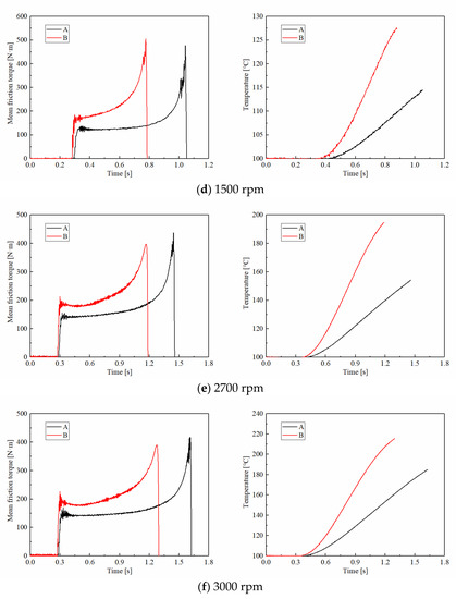 Figure 8 demonstrates the friction torques and disc temperatures of CBFM-A and CBFM-B at different rotating speeds. The friction torques in the early slipping phase of CBFM-B show an upward trend, even without a stable working stage, for rotating speeds below 1500 rpm. However, the friction torque of CBFM-A is stable and long-lasting with little fluctuation. Thus, the friction stability of CBFM-B is worse under a lower rotating speed. As shown in Figure 9a, the variable coefficient of CBFM-A and CBFM-B decreases obviously. The value of CBFM-A decreases from 282 to 32, and that of CBFM-B decreases from 674 to 52. As the rotating speed increases from 600 to 1500 rpm, the change is most obvious, which of CBFM-A is from 284.42 to 45.62. At the same time, the variable coefficient of CBFM-B changes from 676.51 to 177.58. This confirms that the friction stability of A is much better at different rotating speeds. The specific reasons are as follows. Under the low rotating speed condition, the ATF film is thin enough that the friction torque is dominated by the contact torque. Thus, the friction torques of CBFM-A and CBFM-B both increase quickly. Since the porous surface of CBFM-A can store more oil to form a thicker oil film during the engagement process, the friction stability of CBFM-A is far better. With the rotating speed increasing, the hydrodynamic torque dominates gradually at the early filling phase, thus the stable working stage appears at a high rotating speed. However, as the engagement processes, the asperity contact dominates the friction again.
