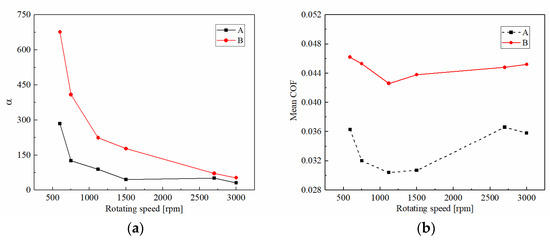 The variable coefficients of friction torque in stable working stage (a) and the mean COF of CBFM-A and CBFM-B (b) at different rotating speeds.
