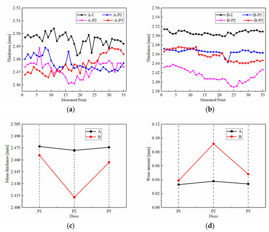 A-I is the pre-test measured thickness of CBFM-A; A-P1, A-P2, and A-P3 are the post-test measured thicknesses (a). B-I is the pre-test measured thickness of CBFM-B; B-P1, B-P2, and B-P3 are the post-test measured thicknesses (b). The mean thicknesses of discs (c) and the wear amounts (d).