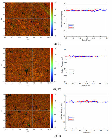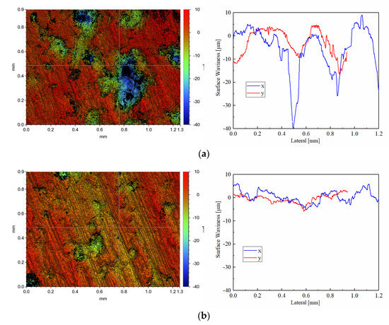 The white light interferometric profilometry (×50) and surface waviness of pre-test in CBFM-A (a) and CBFM-B (b).