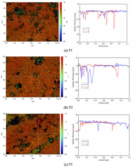 The post-test white light interferometric profilometry of CBFM-A and CBFM-B are shown in Figure 12 and Figure 13. Compared with the pre-test surfaces in Figure 11, the post-test surfaces are more flattened. The reason for this is the peaks are cut during the test process. Thus, the changes in roughness can be calculated by the wear degree as well as thickness.