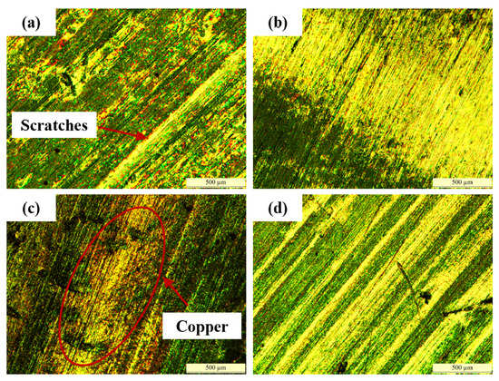 Furthermore, Comparing the morphology parameters of different friction discs in CBFM-A or CBFM-B, it can be seen that the values of P2 are significantly lower than those of P1 and P3. Otherwise, the metallographic diagrams of the steel plates corresponding to the P2 discs are shown in Figure 14. The steel plates have obvious scratches, as shown in Figure 13a. However, the steel plates of CBFM-B appear the phenomenon of copper-transfer, as shown in Figure 13c, a large amount of friction material is bonded to the steel plates. It means that material transfer occurs on the friction disc during the test process. Moreover, the length, depth, and several scratches in CBFM-B are significantly higher than those in CBFM-A. Above all, the conclusion can be made that the wear degrees of different discs are not consistent, and the wear degree of P2 is more serious.