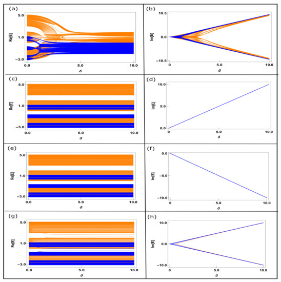 - Hatano, N.; Nelson, D.R. Localization Transitions in Non-Hermitian Quantum Mechanics. Phys. Rev. Lett. 1996, 77, 570. [Google Scholar] [CrossRef]