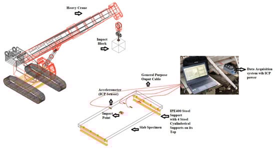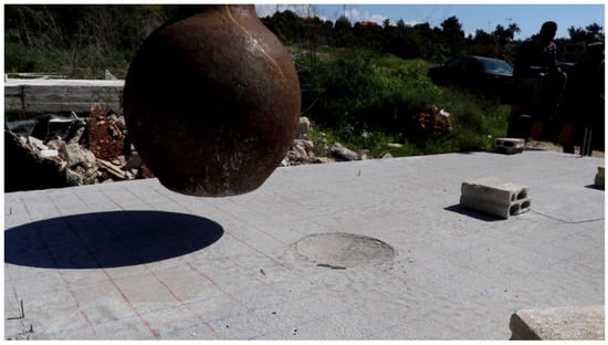 The experimental analysis consists of simulating a slab subject to a series of successive impacts. The tests involve dropping a steel ball of 600 kg as illustrated in Figure 5 from a given height of 14 m. The steel ball velocity just before impact is about 16.57 m/s. The impact energy (E) and block velocity (v) just before impact are approximated by mean of the relation: