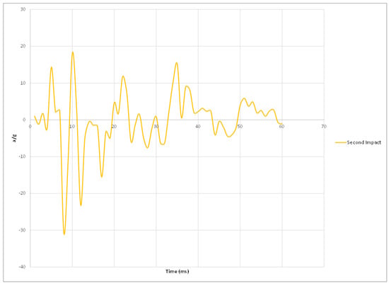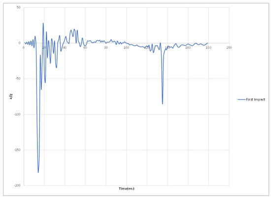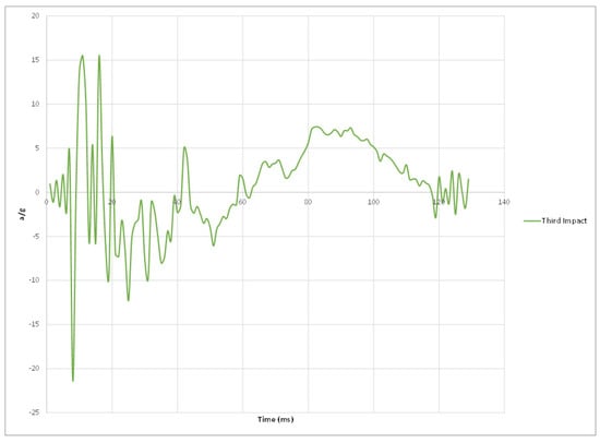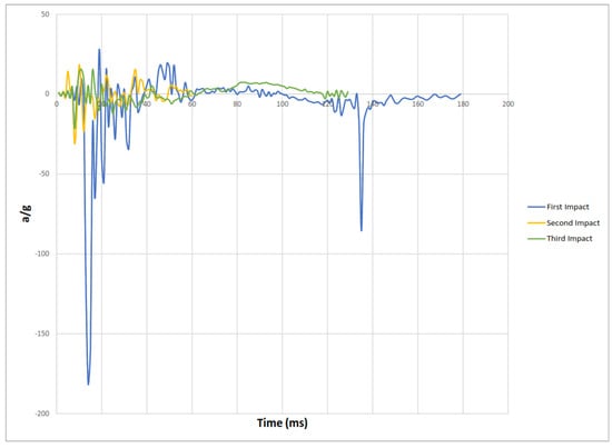 Experimental results of the three impacts are summarized in Table 2 where peak acceleration for each impact was extracted from the accelerometer readings illustrated in Figure 11, Figure 12, Figure 13 and Figure 14.