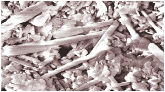 As the plasticity of sulfur pulp is negligible, granulation binders are required. Herein, as a support material stabilizing waste sulfur properties, halloysite (aluminosilicate clay mineral) was introduced. Its advantage is that it is inexpensive, easily available and occurs naturally. The halloysite used in this experiment was obtained from the “Dunino” open pit mine, located in Dunino (southwestern Poland). The halloysite grain agglomerates consisted of individual loosely spaced particles (crystals) in the form of nanotubes of various diameter and length, as well as of nanoplates (Figure 2). This material was naturally saturated with iron and titanium oxides (Figure 1e), e.g., magnetite, magnesioferrite, ilmenite, hematite and goethite. Iron oxides cause pigmentation of halloysite to a rusty-reddish color. In this study, dried halloysite powder with a moisture content of 5% was used.