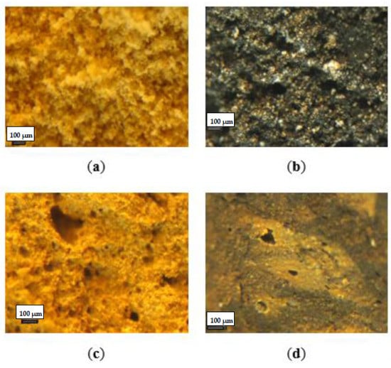 The granules of the prepared fertilizers had a porous structure (Figure 3a–d). Granules of fertilizers A, B and C were characterized by smaller compaction than granules of fertilizer D, whose structure was visibly more concentrated.