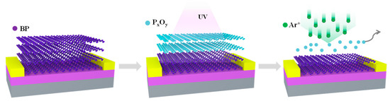 Among 2D materials, black phosphorus (BP) exhibits a range of properties, such as a thickness-dependent bandgap [1,2], high carrier mobility [3], and extraordinary thermoelectric properties [4]. Various reports have shown the exceptional optical properties, optoelectronic properties, and biomedical performance of BP devices [5,6,7,8,9,10], which makes it a potential candidate for next-generation materials. However, the lack of a bottom-up approach for film fabrication limits its practical applications, and issues of the degradation of BP for applying a designed thickness to form high-quality surfaces have been investigated. Wet chemical and thermal treatment require not only controlling the thickness of BP flake but also maintaining its stability [11,12]. Conductive atomic force microscope anodic oxidation and electron beam sculpting were reported to accomplish nanopatterning and layer-by-layer thinning of BP [13,14]. Thermal oxidization [15,16] and plasma [17,18,19] treatment are established, commonly used thinning processes. Although using one of these thinning processes alone can thin down BP flakes, the residual oxidation products from oxidization and the non-uniformity of plasma dry thinning should be considered. Among these methods, UVO has displayed both low cost and easy control [20,21]. The oxide layer induced by UVO formed to form on the BP surface makes it more stable than that in ambient conditions but influences the electronic performance of devices.