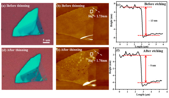 Figure 2a,d show the optical microscopy images of the exfoliated BP flakes before and after light UV thinning and Ar treatment, respectively. The surface morphology and thickness were monitored by AFM, as shown in Figure 2b,c,e,f. Although the samples were vacuum-packed after experiments to avoid degradation, there were some small bubbles observed in the BP surface in optical microscopy images, shown in Figure 2b, which is due to airborne H2O and O2 during optical microscopy observation [22,23], and bubbles formed again more obviously during AFM measurements, shown in Figure 2e. Then, the BP sample was annealed in a N2 atmosphere for 1 min at 300 °C. The resultant sample, presented in Figure 2f, was measured to be ~8 nm thick by AFM, compared with the thickness of ~13 nm before thinning shown in Figure 2c. Meanwhile, the measured surface roughness of the thinned BP flakes is 1.76 nm, compared with 1.73 nm before thinning, indicating little change in the surface. Since the AFM characterization was performed after the Raman characterization and a high power of laser was used during the Raman test, this results in the broken point in the surface of the BP flakes in Figure 2e.