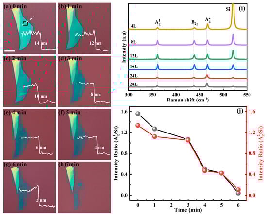 Optical images of mechanically exfoliated BP flakes treated with UV light radiation at different times and 300 °C annealing in N2 atmosphere (a–h). The length of the scale bar is 5 µm. Thinned thicknesses of BP flake as a function of the radiation time are shown as white lines. (i) Raman spectra of the BP flake being treated for various UVO light radiation corresponding to (a–g). (j) Intensity ratio of the A1g/Si and A2g/Si as functions of the UVO light radiation time.