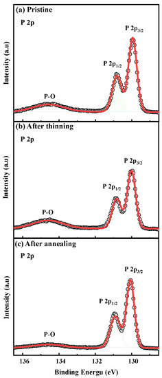 Figure 4 displays the chemical bonding information on an element of the BP flake before and after treatment by X-ray photoemission spectroscopy (XPS). Survey XPS spectrum of BP flakes was shown in Figure S1. All the data are calibrated with the C 1s peak, which is recorded as constant binding energy of 284.6 ± 0.2 eV from the adventitious carbon. Before thinning treatment, the decomposition of the P element into two peaks was located to ~129.9 and 130.8 eV, assignable to 2p3/2 and 2p1/2 binding energy, respectively, shown in Figure 4a. The broadband located at ~134 eV is regarded as the contribution to BP oxidation during the treatment process, including P-O-P, O-P=O, and P2O5 [26]. As shown in Figure 4b, after treatment with UVO for 2 min and slight plasma, the intensity of the peaks at 2p3/2 and 2p1/2 decreased and the content of the P element changed from 44.63% in pristine to 39.51%, which shows that the thinning process worked. Additionally, thinning by this method induced an increase in the content of the oxygen element from 32.2% to 38.47%, and the intensity of peak at 134 eV increased. Moreover, after 300 °C annealing in a N2 atmosphere, the peak intensity corresponding to 134 eV decreased, shown in Figure 4c. The value of the calculated relative content of the P element is 41.5%, which reveals that the oxygen element introduced during the thinning process can be partly reduced by annealing. Despite oxidation occurring in BP flakes during thinning, the oxidation inversely contributes to the protection of BP [27].