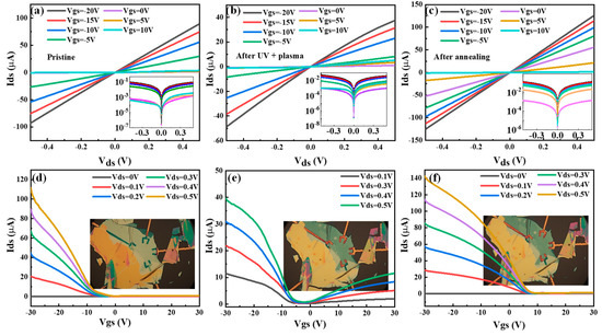 To investigate electrical device performance during the thinning process, a ~30 nm BP-based black-gate field-effect transistor (FET) on 300 nm SiO2/Si was fabricated and measured in vacuum conditions at room temperature. Figure 5a–c shows source–drain current (Ids)–source–drain bias (Vds) characteristics at pristine, after thinning, and after 300 °C annealing treatment, respectively. Insets are log-scale plots with unit ~A on the y-axes. After the thinning process, current modulations decrease and then increase after the annealing process. With variable black-gate (Vgs) voltage from −20 V to 10 V, current modulations observed throughout the thinning process indicate ohmic contact performance, as confirmed by the linear Ids–Vds curves. Figure 5d-f displays the transfer characteristics (Ids-Vgs) of BP FET at pristine, after thinning, and after annealing, with Vds changing from 0 V to 0.5 V, respectively. Insets show optical microscopy images of BP FETs during the thinning process corresponding to Figure 5a–c, respectively. The changed color of the BP flake indicates decreasing thickness. The device exhibits p-type dominant behaviors, which is in agreement with the previous reports [2,3]. After thinning under slight UVO radiation for 5 min and Ar+ plasma (step 1) and annealing at 300 °C in a N2 atmosphere for 1 min (step 2), the transfer curves of BP FET are dramatically changed, shown in Figure 5d-e. After the thinning process, the BP FET shows ambipolarity characteristics in the translated curve. It can be explained by the passivation protection of PxOy introduced by the thinning process, which can be referred to previous reports on transistors with a weak n-type after BP passivation presentation [15,28]. The off-state current at high positive-gate voltage decreases, and the on/off current ratios (the ratio of the Ids measured with and without the gate voltage when the Vds is constant) increase significantly from 11 to 281 after steps 1 and 2. This result is due to the effective reduction of the channel thickness, which is consistent with the previous analysis of the AFM images. Further decreases in channel thickness will result in decreases in the interlayer resistance of the BP films and thus in increases in carrier conduction from the electrical contacts formed on the top surfaces of the BP films [29]. The mobility was estimated with the following formula, μ_eff = L/(W · C_g · V_ds ) · (I_ds/V_gs), to identify more about the change of BP FET performance under different processes. L and W are the length and width of the device channel, respectively, and Cg is the oxide capacitance per unit area (11.5 nF/cm2 for 300 nm SiO2) [30]. After step 1, the thickness of BP as-exfoliated decreased, and a strong interface state formed between BP and BP oxide layers that might trap electron conduction, which is consistent with the previous analysis of the XPS [31]. After step 2, thermal annealing reduced the trapping of carriers at interface defects induced by step 1 and was confirmed by the current curves in Figure 5f. The estimated mobility increases from 274 to 492 cm2 V−1·s−1 and is accompanied by the threshold voltage shift after thinning. These observations are attributed to p-type doping from atmospheric adsorbates, similar to effects observed with other 2D materials [22,32]. Due to the short time of thinning, the exfoliated material itself is not too thin to significantly enhance the mobility of BP FET. Further work needs to be done to investigate the performance of the device by this method.