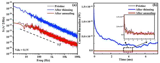 To further validate the characteristics of the BP thinned by this method, we studied the noise performance of the sample. The same sample was put into a vacuum chamber at room temperature at every step of the experiment. Figure 6a shows the spectra density (SI2) under different treatments. Compared with the pristine, there is a slightly stronger noise density that occurred after BP thinning, which indicates impurities or defects on the induced BP. It is clear that the impurities or trap centers due to defects at the BP interface contribute significantly to noise density, which can be proven by XPS analysis of the changes above the P-O peak. Fortunately, it can be seen that the noise density obviously decreased after annealing treatment. Carriers from the impurity or defects we considered decreased during the annealing process, as well as the residues from device fabrication. On the other hand, the increase and decrease in carriers can also be proven by the current amplitude fluctuations, as shown in Figure 6b. The pristine sample indicates a small amount of fluctuation, but the sample after thinning shows a large one, which shows that the thinning process introduced defects and impurities even though it thinned the BP flakes [33,34,35,36]. After annealing, the current fluctuation due to carriers was effectively suppressed, as shown in the inset image, indicating a decrease in the defects or impurities on the BP. Consequently, the annealing process can improve the surface of BP, and this can be easily seen from the current fluctuations.