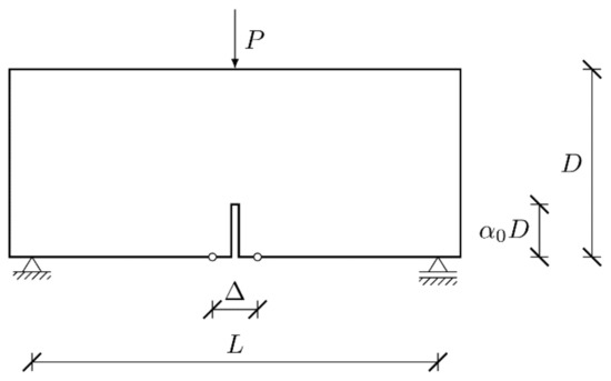 Fracture process in one of the fundamental phenomenon in concrete. The adequate description is a crucial issue and it is essential to formulate a proper physically meaningful constitutive law. There have been several experimental campaigns on fracture in concrete. One of the recently reported research was conducted by Hoover et al. [32]. They examined 128 unnotched and notched concrete beams under three-point bending. The geometry of a beam is shown at Figure 1. Four different sizes with five notch dimensions were analysed. The beam height D was taken as 500, 215, 93 and 40 mm for a huge, large, medium, and small specimen, respectively. The total length of the beam was 1200, 516, 223.2 and 96 mm for a huge, large, medium, and small specimen, respectively. The notch to depth ratio α 0 (relative length of a notch with the respect to the beam’s height D ) was 0.0 (no notch), 0.025, 0.075, 0.15 and 0.30. In total, 18 geometries were defined (beams with the height equal to D   = 93 mm and D = 40 mm with α 0   = 0.025 were not cast). The span length L was equal to 2.167 D for all beams. The thickness was set to B   = 40 mm. The width of the notch was 1.5 mm. In addition, 36 companion samples were prepared to determine the compressive strength, modulus of rupture, Young’s modulus, and Poisson’s ratio. All specimens were cast within three hours from the same batch of concrete. They were kept in identical curing and environmental conditions. As a consequence, low scatter of results was achieved, and all beams had virtually the same material properties.