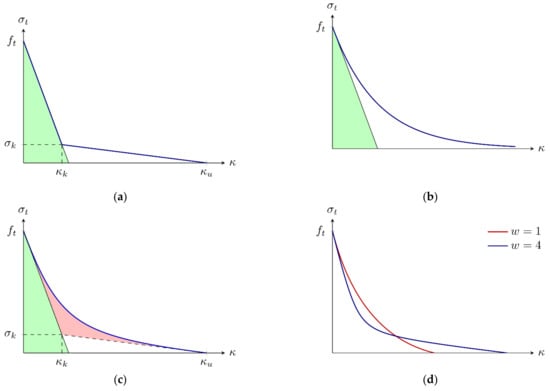 With a parameter t and a weight w attached to the kink point. The weight w controls the shape of the curve; for w   = 0 a linear softening is obtained and for w   =   it coincides with the bilinear diagram (Figure 3a). Here the “total” fracture energy used to define the kink point on the underlying bilinear softening curve is denoted as G B and it is not equal to the total fracture energy G F (except for the case with w   =   ). The term G F G B can be interpreted as the area between the Bezier rational curve and the bilinear curve (marked as a red area in Figure 3c). The larger the value of the weight w is taken, the smaller difference G F G B is obtained.