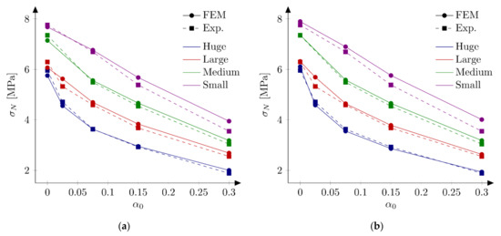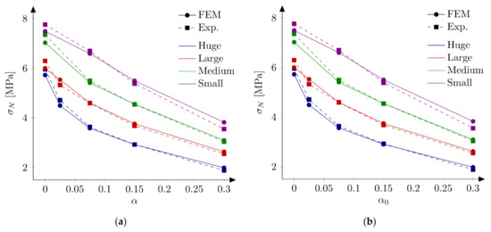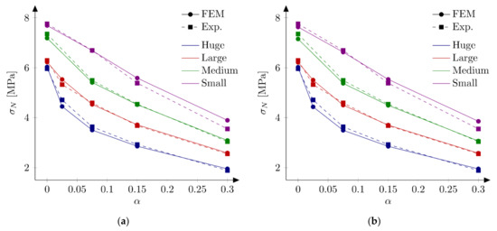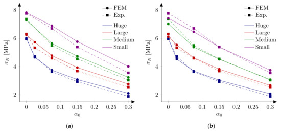 Figure 12. Nominal and experimental strengths with exponential softening law and: (a) set S10: f t   = 5.2 MPa and G f   = 35 N/m; (b) set S11: f t   = 5.2 MPa, G f   = 35 N/m, b = 1 cm, β 0   = 0.6.
