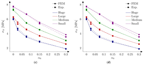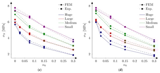 Figure 9. Nominal and experimental strengths with bilinear softening law and: (a) set S5: f t = 4.8 MPa, G f   = 48 N/m, b   = 0.5 cm, β 0   = 0.7; (b) set S6: f t   = 4.8 MPa,   G f = 48 N/m, b   = 1.0 cm, β 0   = 0.8; (c) set S7: f t   = 5.2 MPa, G f   = 42 N/m, b   = 0.5 cm, β 0   = 0.7; (d) set S8: f t = 5.2 MPa, G f   = 42 N/m, b   = 1.0 cm, β 0   = 0.8.