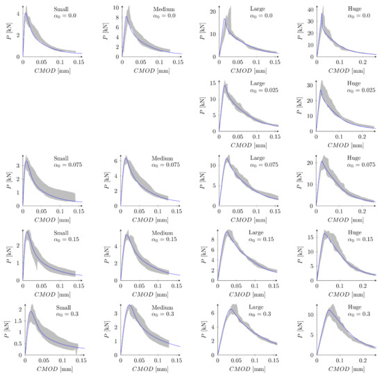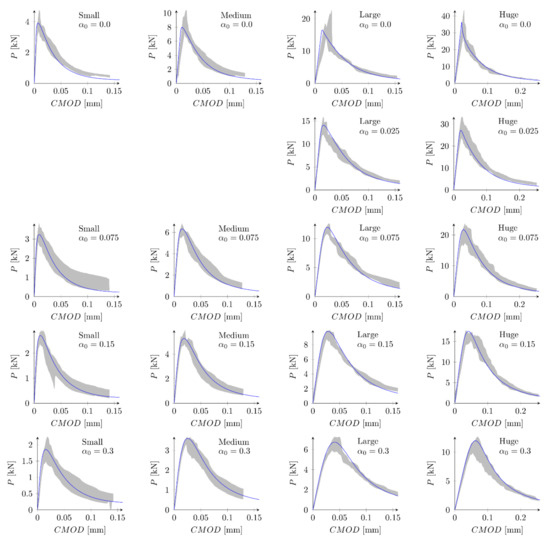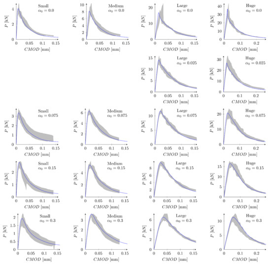 In the next phase, the influence of the boundary layer is examined. Material parameters S1 and S2 are adopted. For each parameters set two values of the boundary layer thickness are analyzed: b = 0.5 cm and b = 1.0 cm. Nine discrete values of the reduction coefficient at the edge β 0 in the range of 0.1 to 0.9 and the increment of 0.1 are assumed. Based on simulations of all geometries and the analysis of errors E r r 1 and E r r 2 the best values of the coefficient β 0 are determined. Finally four new parameter sets are defined: S5: f t   = 4.8 MPa, G f   = 48 N/m, b   = 0.5 cm and β 0   = 0.7, S6: f t   = 4.8 MPa, G f   = 48 N/m, b   = 1.0 cm and β 0   = 0.8, S7: f t   = 5.2 MPa, G f   = 42 N/m, b   = 0.5 cm, β 0   = 0.7 and S8: f t   = 5.2 MPa, G f   = 42 N/m, b   = 1.0 cm, β 0   = 0.8. In above sets almost the identical and relatively high values of the coefficients β 0 are assumed for different values of the boundary layer thickness. Figure 9 shows calculated nominal strengths compared with experimental values and calculated nominal strengths are listed in Table 3. Set of force—crack mouth opening displacement (CMOD) curves for all 18 beams is presented at Figure 10 (set S7), with grey areas between experimental extreme curves (here numerical force values are not corrected with the factor C f ). It can be seen all numerical results fit into experimental limits. The error measures are equal to: E r r 1   = 0.09% and E r r 2   = 2.92%, E r r 1   = −0.12% and E r r 2   = 2.90%, E r r 1   = 0.30% and E r r 2   = 2.27%, and E r r 1   = 0.08% and E r r 2   = 2.28% for the set S5, S6, S7 and S8, respectively. In all cases the largest error E r r 0 is obtained for the small beam with the notch to depth ratio α 0   = 0.3 and it is about 9%. The errors E r r 0 from the remaining beams do not exceeded 5.5% (its absolute values). Comparing with simulations S1–S4 the presence of the boundary layer decreases the error measures, especially for the sets with the tensile strength equal to f t   = 5.2 MPa (set S2 versus sets S7 and S8). On the other hand, input parameters (S1 and S2) already produce relatively small errors. By further parametric studies even better parameters can be found. For instance FE-calculations with the following parameters (set S9): f t   = 5.0 MPa and G f   = 48 N/m give the following errors: E r r 1   = 0.67% and E r r 2   = 2.69%, comparable with errors obtained with sets with declared boundary layer. Therefore, the definition of the boundary cannot be treated as the significant improvement of the results. Simulation results do not allow also for unique identification of the boundary layer thickness.