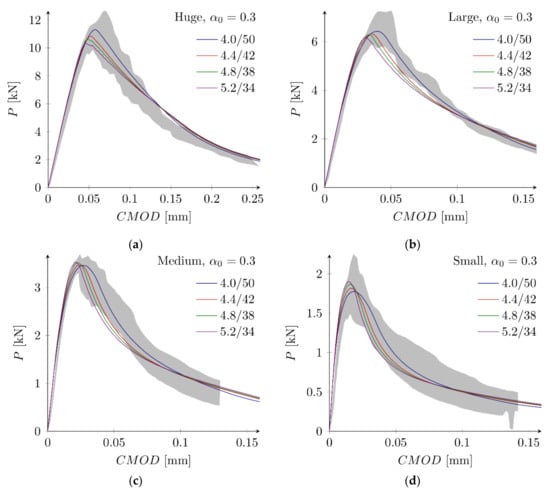 Figure 11. Force–displacement curves for notched ( α 0   = 0.3) beams and sets N1–N4: (a) huge beam; (b) large beam; (c) medium beam; (d) small beam (the first number in a label is the tensile strength in MPa, the second number is the initial fracture energy in N/m).