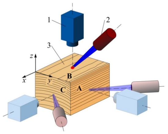 Thermal diffusivity measurement layout. 1—thermal camera, 2—laser, 3—wood sample, A—radial cut, B—tangential cut, C—crosscut.