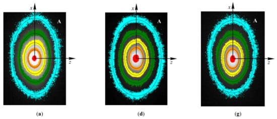Every recorded frame was then processed according to the original models and algorithms described in [11,12,13,43,44]. In particular, each frame in a time interval such as 1–3 s after heating onset, with a pixel-by-pixel subtracted base frame obtained before heating, was used to determine the main axes of several tens of elliptical isotherms. This array of axes lengths depending on the temperature was approximated by a model function, so that each frame recorded at a known time yielded two values determined by three independent components of the aij tensor. The values obtained for individual frames were then averaged in the above time interval, so that the method took into account the signals from many hundreds of thousands of pixels (~200 pixels per ellipse, ×~30 ellipses, ×~100 frames) to obtain two scalar values. This greatly reduced various types of noises, while the absolute calibration of temperature-to-signal transformation did not affect the results at all as long as it remained constant across the field of view. Each frame was processed individually, so that even the change of that calibration over time was insignificant. To compute real thermal diffusivity tensor components in the orthotropic case, at least two tests on perpendicular faces were required.