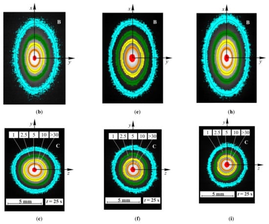 Thermal images for pine (a–c), oak (d–f), and lime (g–i) at A, B, and C faces: along the fibers, radial cut (a,d,g), along the fiber, tangential cut (b,e,h), and crosscut across the fibers (c,f,i). The number on the isotherms indicates the overheating temperatures above the ambient temperature: 1 ± 0.25, 2.5 ± 0.5, 5.0 ± 0.5, 10 ± 2, and >30 °C; t—time after heating onset.