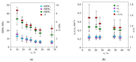 In the first stage of the experiments, we studied Brinell hardness HBW, Young’s modulus E (Figure 4a), and the main components a1, a2, and a3 of thermal diffusivity tensor (Figure 4b) dependencies in common pine wood on its humidity w. The absolute and relative values of a1, a2, and a3 are affected by w differently. The a1 component displayed significant dependence on w along the fibers, while across the fibers, the dependence of the components a2 and a3 upon w was weak, and they were statistically indistinguishable. Hence, it was reasonable to introduce the averaged value an = (a2 + a3)/2 of thermal diffusivity normal to the fibers. The relative values al/an that characterize thermal diffusivity anisotropy were even more sensitive to humidity change than the absolute ones (Figure 4b).