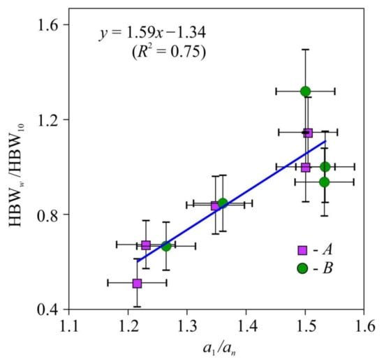 Dependence of the relative macrohardness HBWw/HBW10 of pine wood upon thermal diffusivity anisotropy—a1/an. HBW—Brinell hardness (12.7 mm sphere diameter, 1 mm indentation depth), a1, an—thermal diffusivity coefficients along and across the fibers. HBWw/HBW10—HBW values on the faces А and B, as shown in Figure 2 normalized to HBW at humidity w = 10% (HBW10).