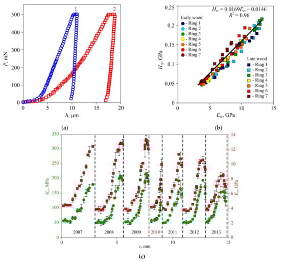 Effective microhardness HIT and Young’s modulus EIT in annual rings of pine wood, (a) Typical P–h diagrams for late (1) and early (2) wood; (b) dependence of hardness HIT upon Young’s modulus EIT for seven sequential growth rings; (c) spatial distribution of hardness HIT and Young’s modulus EIT across sequential growth rings r. The positions of ring boundaries are shown by dashed lines. The corresponding years for the growth rings are shown below the data points. An extraordinary dry year is indicated in red.