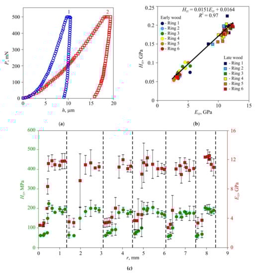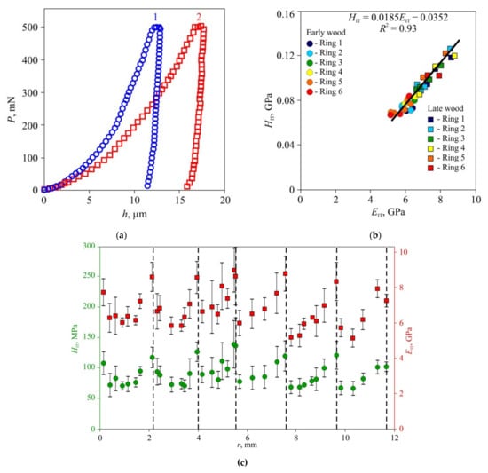 Effective microhardness HIT and Young’s modulus EIT in annual rings of oak wood, (a) Typical P–h diagrams for late (1) and early (2) wood; (b) dependence of hardness HIT upon Young modulus EIT for seven sequential growth rings; (c) spatial distribution of hardness HIT and Young modulus EIT across sequential growth rings r. The positions of ring boundaries are shown by dashed lines.