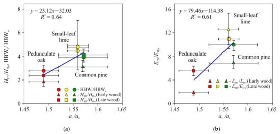 In the third stage of the experiments, tensor aij components and Brinell hardness HBW were measured for the three wood species. Effective values of HIT, EIT, HBW, and thermal diffusivity anisotropy are presented in Table 1. As can be seen, all mechanical characteristics correlated with the ratio of the main components of the thermal diffusivity tensor, and for E, such correlation was about three times stronger than for HIT or HBW (Figure 9). It should be mentioned that the mechanical and thermal properties were correlated in all three studied species with significantly different microstructures.