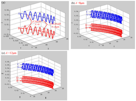 Simulation trajectory of grains in both processing. (a) C-ELID A = 0 and UVA-ELID A = 4 μm; (b) UVA-ELID A = 8 μm; (c) UVA-ELID A = 12 μm.
