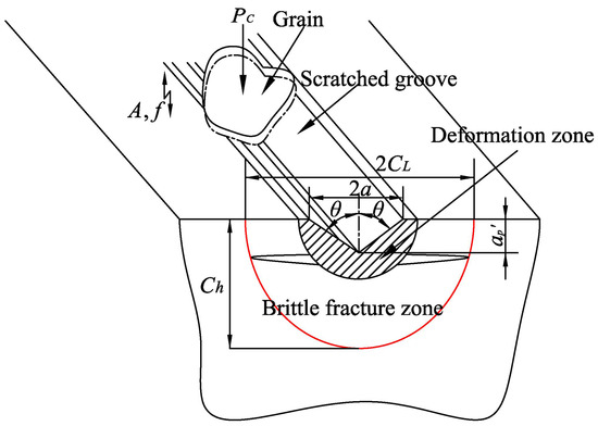 During the grinding processing, the action of grains on the workpiece was often regarded as an indentation experiment. It was assumed that the workpiece should be a rigid-plastic. According to Swain and Lawn [18], the relationship between the contact force PL and the feature size a was expressed as follows.